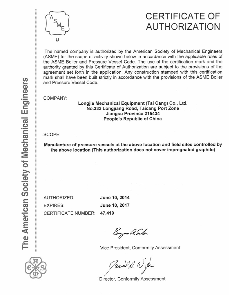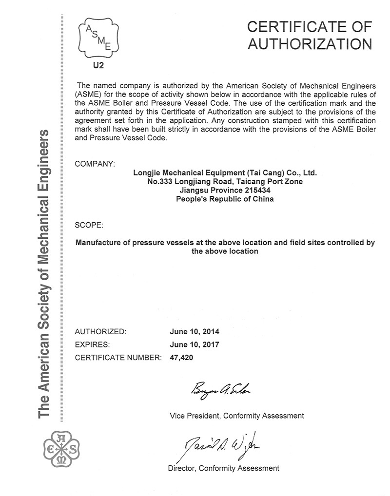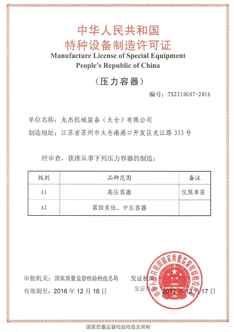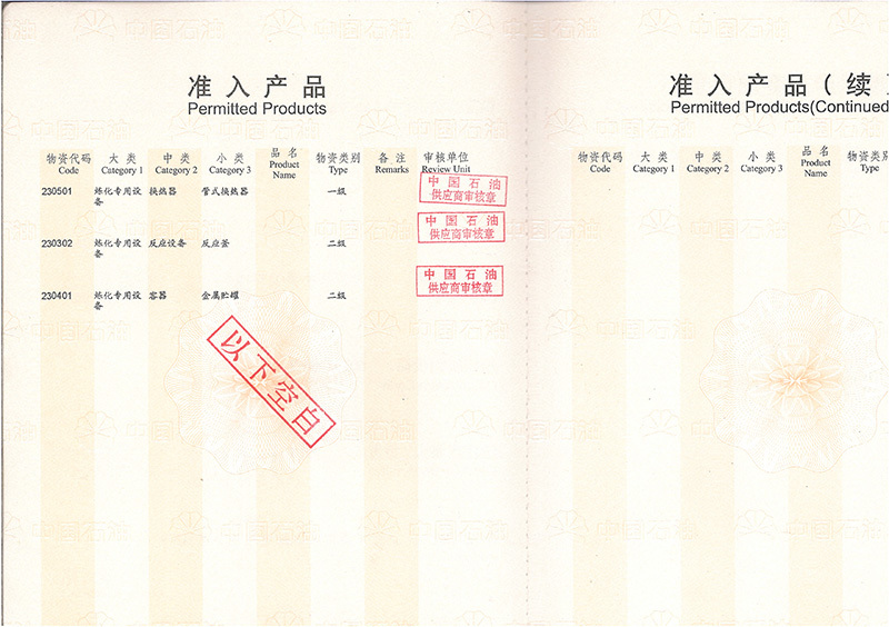 公司具有中國高、中低壓壓力容器生產(chǎn)許可證(A1級, 包含設(shè)計(jì)、制造),ASME U、U2鋼印證書,PED G模式生產(chǎn)資格,是中石化、中石油、中海油、中化集團(tuán)、國家能源集團(tuán)等大型知名企業(yè)的合格供應(yīng)商。